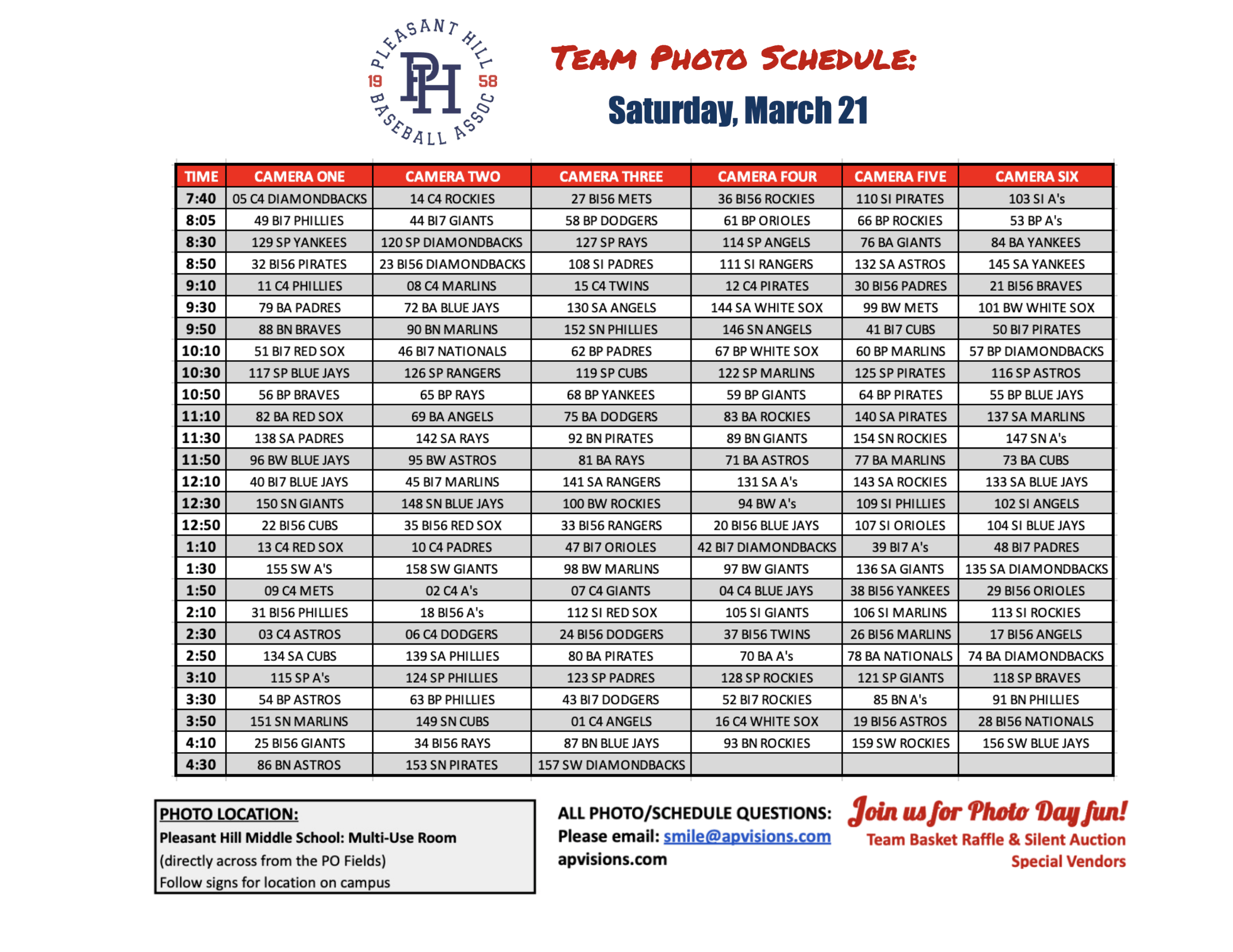 Teams will be photographed throughout the day beginning at 7:40 AM, with multiple camera stations running simultaneously. To check your team’s timeslot, check the posted schedule or contact your coach for your teamβs exact time slot.