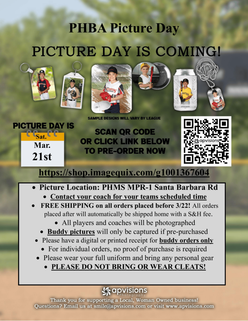 📸 PHBA Picture Day is Coming! ⚾ Get ready for Picture Day on Saturday, March 21! All players and coaches will be photographed, so be sure to arrive at your team’s scheduled photo time and come prepared in your full uniform (but no cleats, please). 📍 Photo Location Pleasant Hill Middle School – Multi-Use Room…
